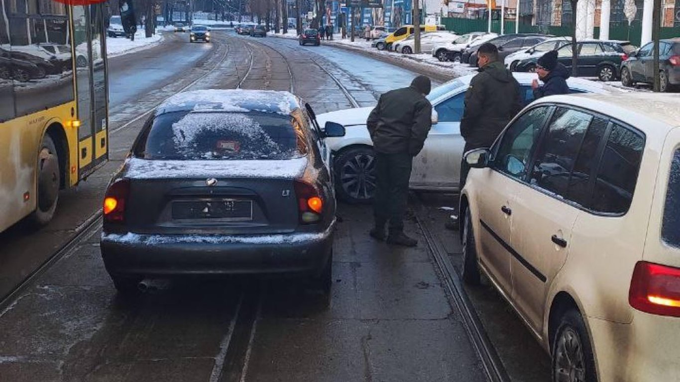 Вранці, 23 грудня, на вулиці Глибочицькій, 73, на трамвайних коліях зіткнулися 2 легкових автомобіля. Через це перекрито рух громадського транспорту, а на вулиці утворився затор.