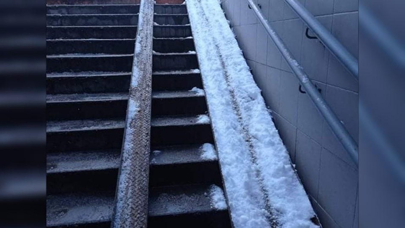 У переході біля Індустріального мосту в Солом'янському районі Києва пандуси, які призначені для інвалідних колясок, літніх людей, велосипедів і тварин стоять у кризі та снігу, комунальники вирішили не розчищати їх.