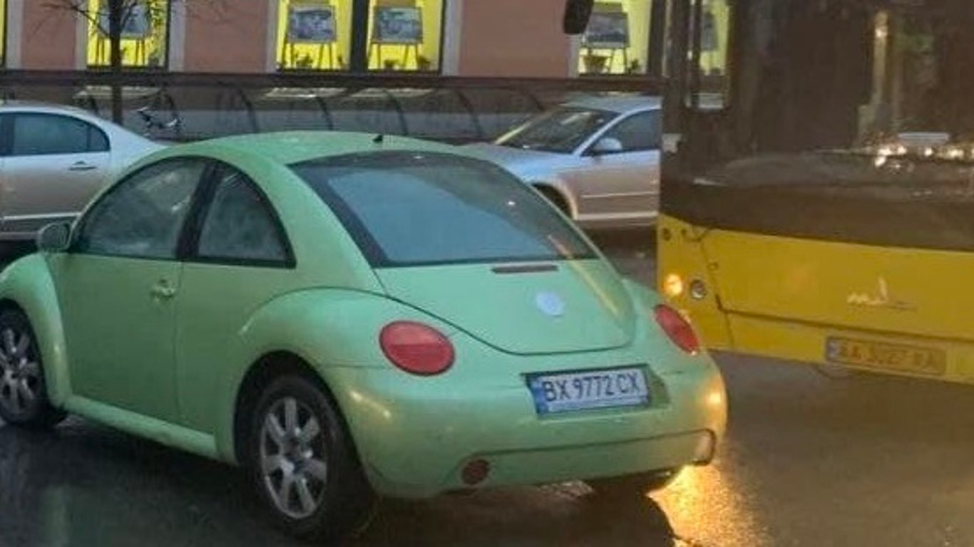 Автомобіль Volkswagen New Beetle був залишений поперек прямування автобуса № 7, який не зміг його об'їхати.