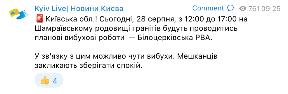Зазначається, що з 12:00 до 17:00 на Шамраївському родовищі гранітів будуть проводитись планові вибухові роботи.